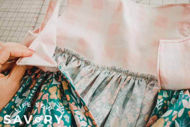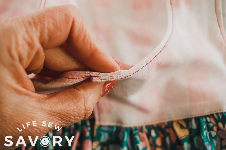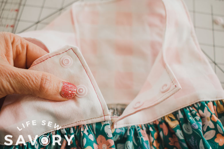 You can finish the front of the skirt two ways. 1. first picture. Fold back the selvedge edges on both side of the open side 1″ to create a button placket {sew buttons or snaps ALL THE WAY DOWN the front of the dress} 2. Mark 4″ down from the top of the skirt and sew the skirt closed from marker to bottom of skirt. This will just create a small placket at the top of the skirt to help get into the dress. Choose the option that works for you.