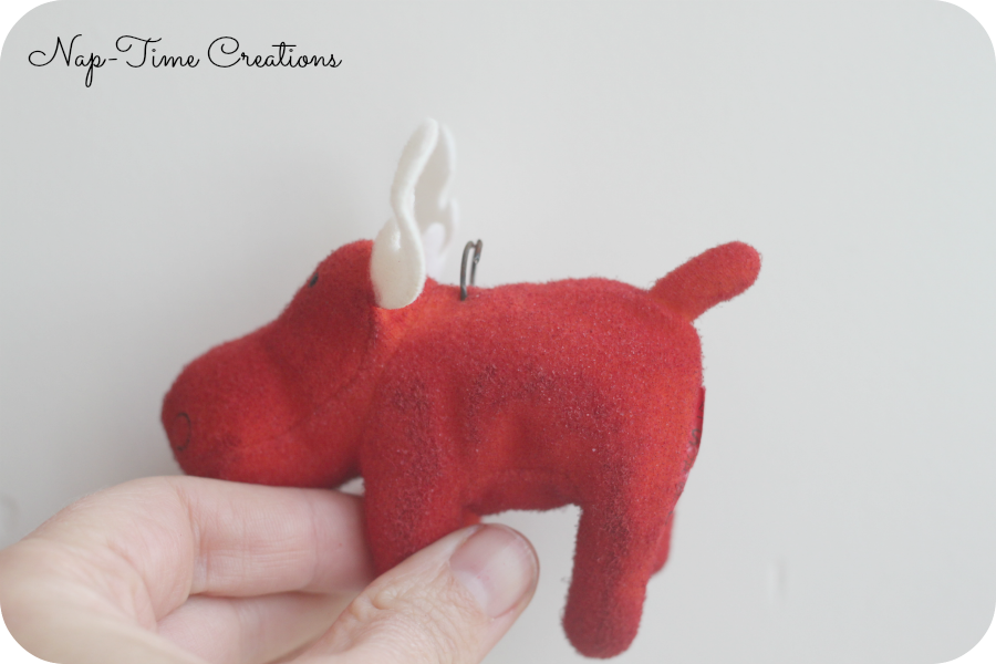 I took a stiff wire {had it around from something else} and poked it through the top of the little animals. I was just able to push it through and then create a loop on the back.